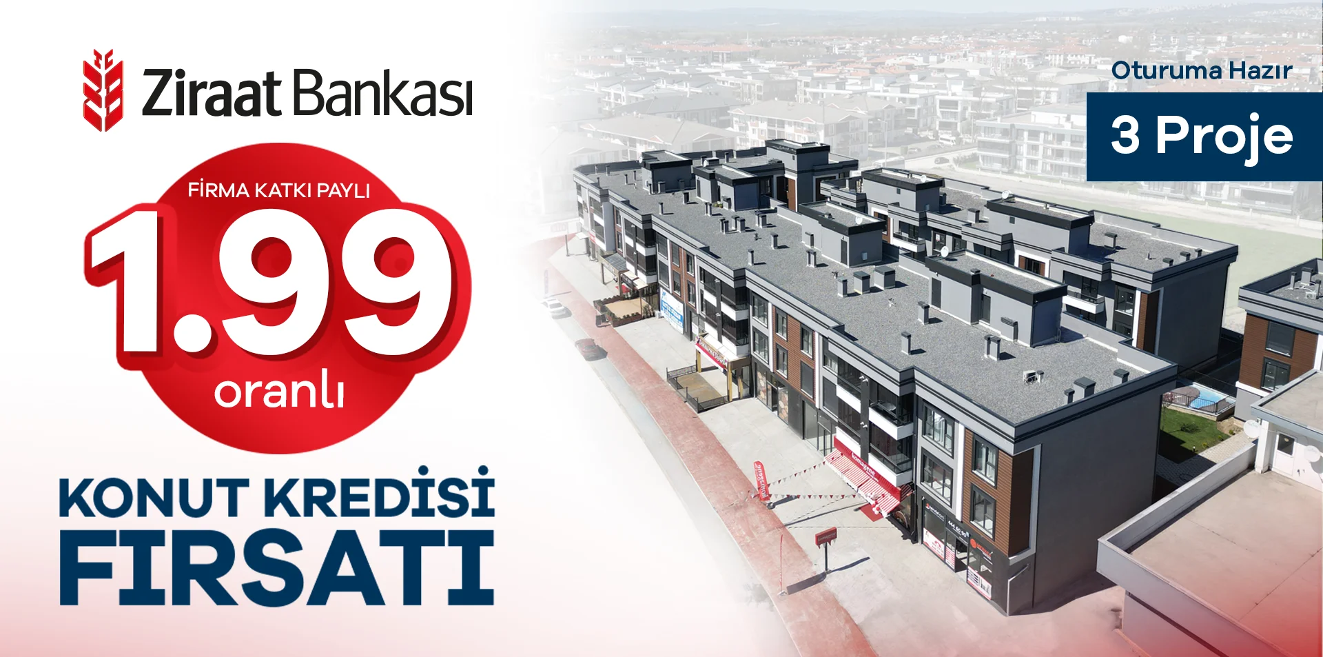 Ziraat Bankası’ndan firma katkı paylı 1.99 oranlı konut kredisi fırsatımız 5 farklı projemizde 120 aya kadar vade seçenekleriyle geçerlidir.